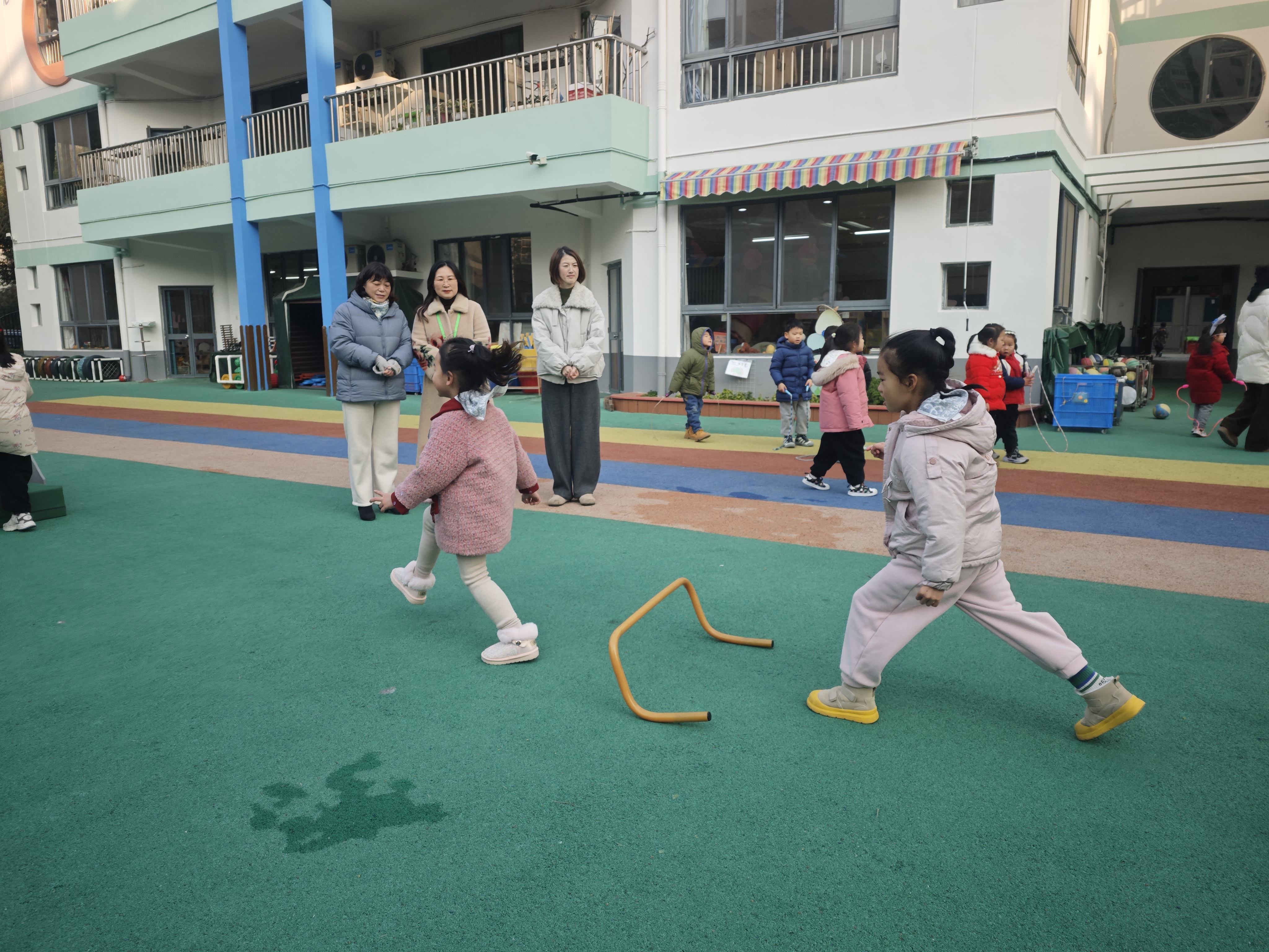 接着,任督学在浦艳园长的陪同下,巡视幼儿晨间活动,并走近孩子们的活动场地,近距离观察幼儿运动的开展情况。 时值冬季,老师们紧扣季节气候特点,全程密切关注每一位幼儿的出汗状态,及时为幼儿垫上吸汗巾、调整外套穿脱,将各项保育防护细节落实得扎实到位。对此,任督学给予高度肯定。